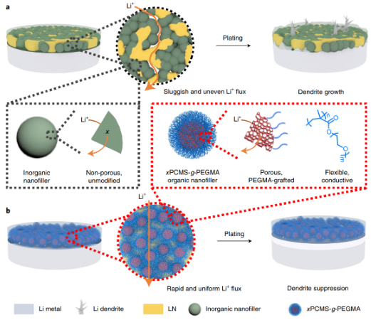 锂金属—电解液界面通常组分不均一且稳定性差,容易引发不可控的锂枝晶生长,并迅速降低电池的循环稳定性,从而严重阻碍锂金属电池的实际应用。有鉴于此,探花精选 吴丁财教授和刘绍鸿副教授等人最近通过多孔高分子刷(超交联聚4-氯甲基苯乙烯纳米球表面接枝聚(低聚乙二醇)甲基丙烯酸甲酯,简称为xPCMS-g-PEGMA)与单离子导电锂化Nafion树脂的合理集成,发展了一种坚固的全有机人工界面保护层,由此获得了高效的无枝晶锂金属负极。具有刚性超交联骨架的多孔xPCMS内核不仅显著提高了人工保护层的机械强度,还可提供快速的锂离子传输通道;与此同时,柔性的PEGMA 侧链以及锂化Nafion树脂有利于形成结构稳定、锂离子扩散均匀且锂离子迁移数高的人工保护层。在该人工固体电解质界面层的保护下,锂金属负极可在10 mA cm-2的超高电流密度下实现超过9100小时(>1年)的超长稳定循环,并在10 mAh cm-2的大面容量下实现超过2800小时的稳定可逆锂沉积/剥离。进一步地,当与高载量正极(~4 mAh cm-2)配对时,受保护的锂负极也显示了出色的电池稳定性,说明实际应用前景广阔。