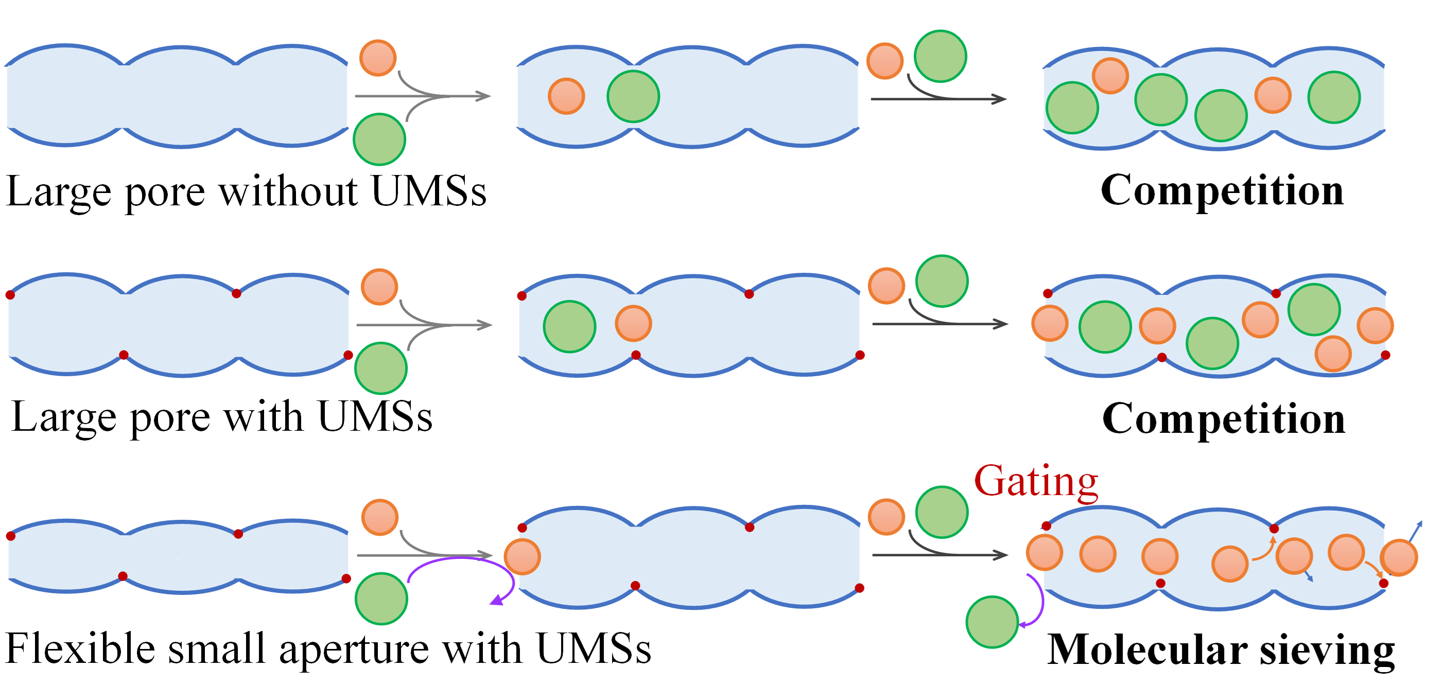 鉴于甲醇和苯具有类似的高沸点,它们均具有较强的物理吸附,因此传统的多孔吸附剂很难实现较高的热力学选择性。相比与传统的多孔材料,金属有机框架(MOF)或称多孔配位聚合物(PCP)常表现出独特的柔性。其中开孔(pore-opening)柔性表现为选择性地被特定分子吸附诱导开孔,但若开孔的尺寸控制不好,很容易发生共吸附,选择性较低。另一方面,门控(gating)柔性同样可以选择性地被特定分子开门,但门控能垒很难控制。