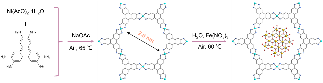 图1:Ni-HITP和γ-Fe2O3@Ni-HITP的合成示意图。首先合成Ni-HITP,随后在纳米孔中封装γ-Fe2O3纳米颗粒合成γ-Fe2O3@Ni-HITP。淡蓝色,镍;黄色,铁;灰色,碳;蓝色,氮;红色,氧。为了清晰起见,省略了氢原子。