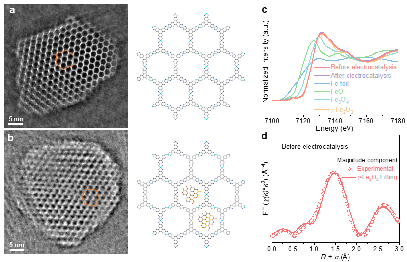 图2:γ-Fe2O3@Ni-HITP的形貌和结构表征。a, 沿着[001]面Ni-HITP的iDPC-STEM图像。 b, 沿着[001]面γ-Fe2O3@Ni-HITP的iDPC-STEM图像。橙色六边形实线中展示了当沿着孔道方向,观察到一些相反对比度的分散的亮点,表明在Ni-HITP中均匀分散的γ-Fe2O3纳米颗粒。c, Fe箔,FeO,Fe3O4,γ-Fe2O3和γ-Fe2O3@Ni-HITP的Fe K-edge XANES谱。d, γ-Fe2O3@Ni-HITP中γ-Fe2O3的EXAFS谱拟合曲线。