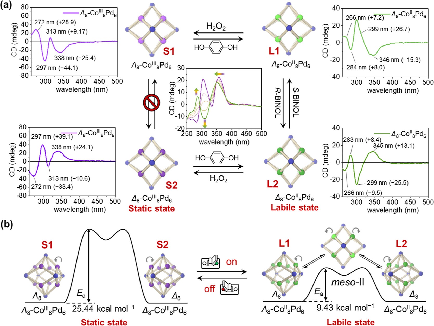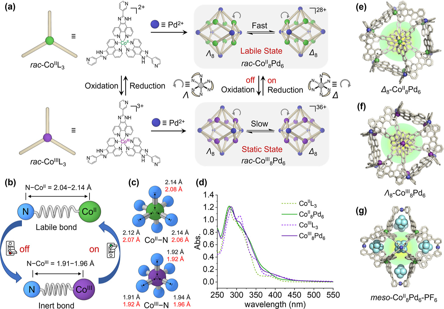 金属-有机笼(MOCs, metal-organic cages)通过其空腔的功能化与分子识别,可以实现多种场景的应用,因此被作为人工模仿蛋白质功能的模型。这种超分子笼的关键组成部分—金属中心的特性极大地影响了整个笼的结构和性能。通过替换不同动态特性的金属中心,可以实现笼立体化学与性能的调控。而在不改变金属中心种类的情况下,通过氧化还原改变金属中心的价态,则可以实现原位动态活性、立体化学与性能的调控与转换。