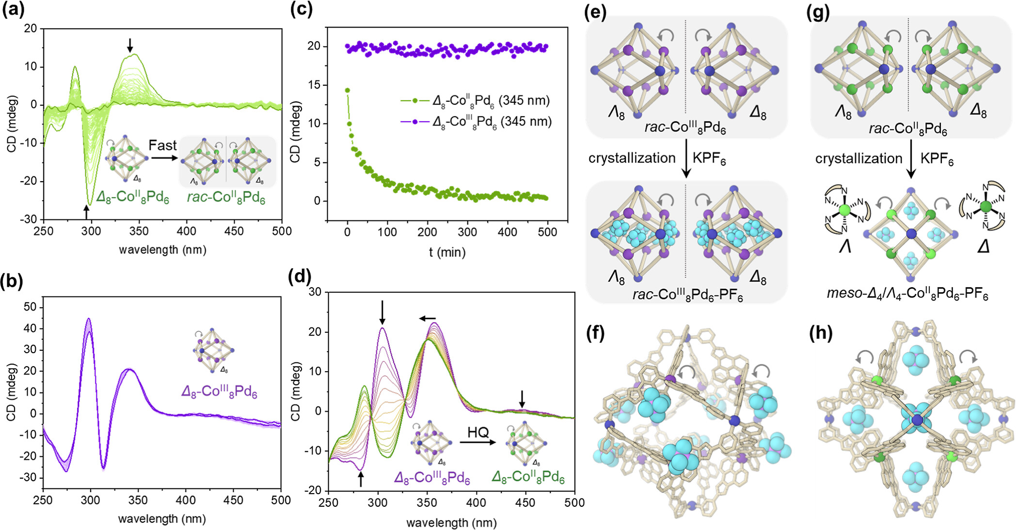 图2. 单一手性Δ8-CoII8Pd6笼与Δ8-CoIII8Pd6笼的立体化学稳定性以及阴离子PF6–诱导的内消旋化