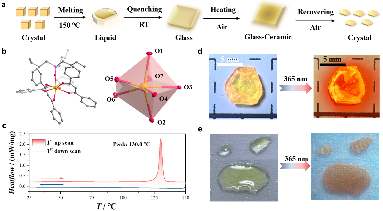 图1.“晶体→液体→玻璃→玻璃陶瓷→晶体”相变过程示意图 (a);1-Ln的晶体结构(b);一轮升降温的DSC测试分析(c) 以及晶态和液态的实物及其发光照片 (d和e)。