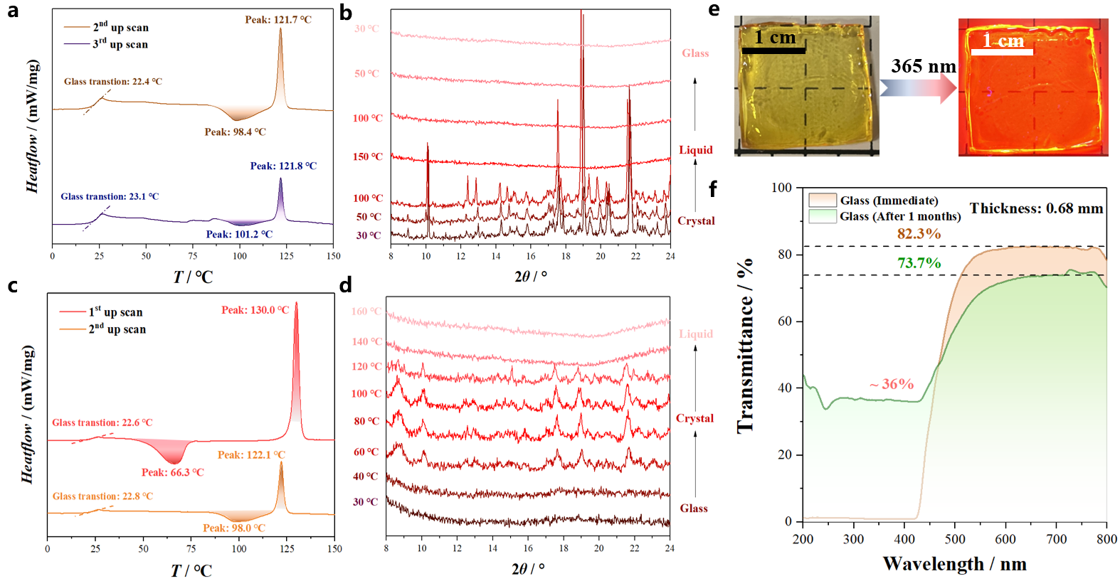 图2.晶态1-Ln及玻璃态1-Ln-Q的DSC测试分析 (a和c);原位变温PXRD衍射图样 (b和d)以及玻璃态1-Ln-Q的实物及其发光照片(e)和透射率曲线(f)。