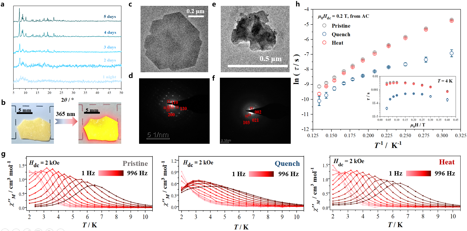 图3.玻璃陶瓷态1-Dy-Q的PXRD (a);实物及其发光照片 (b);TEM (c 和d) 和SADE电子衍射环图像 (d 和f) 以及相关磁学性质分析 (h和g)。