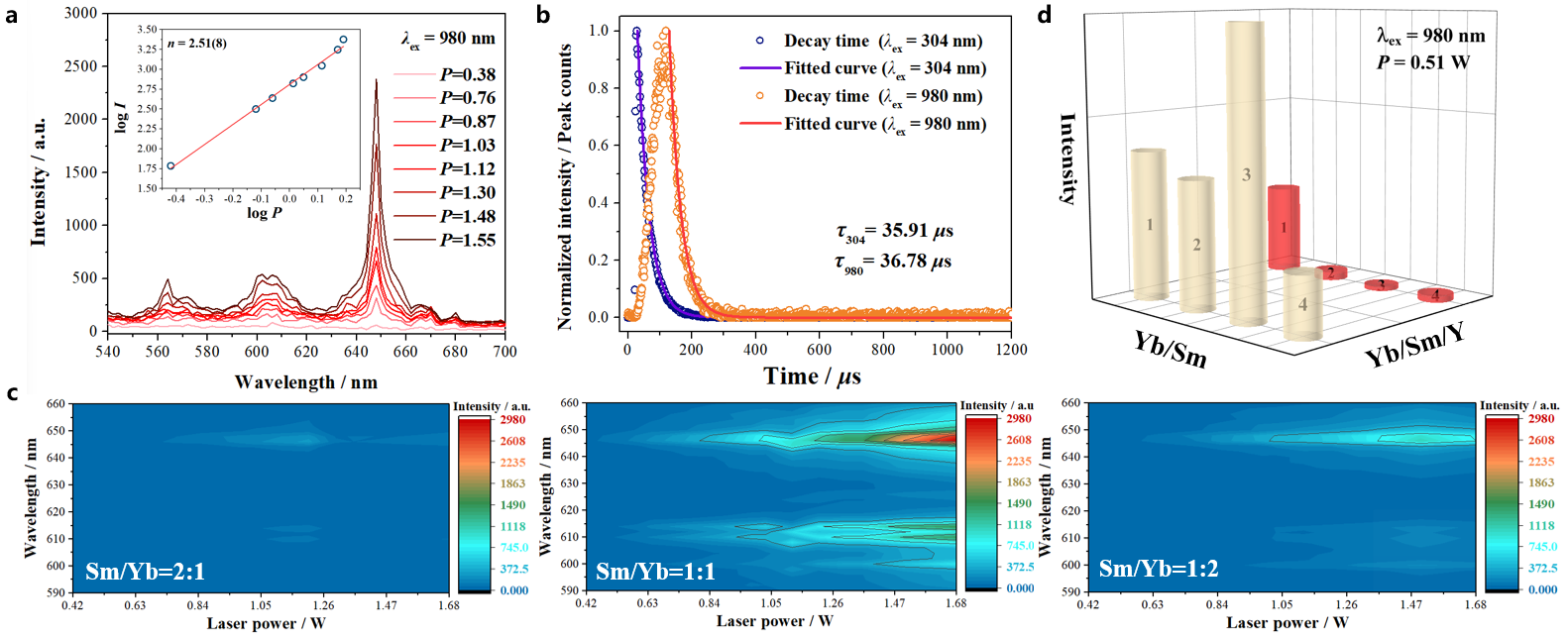 图4.多元分子固溶体(1-Y)/1-Yb/1-Sm 的上转换发光谱图 (a);衰减寿命曲线 (b) 以及不同比例稀土组分的发光射强度分析 (c和d)。