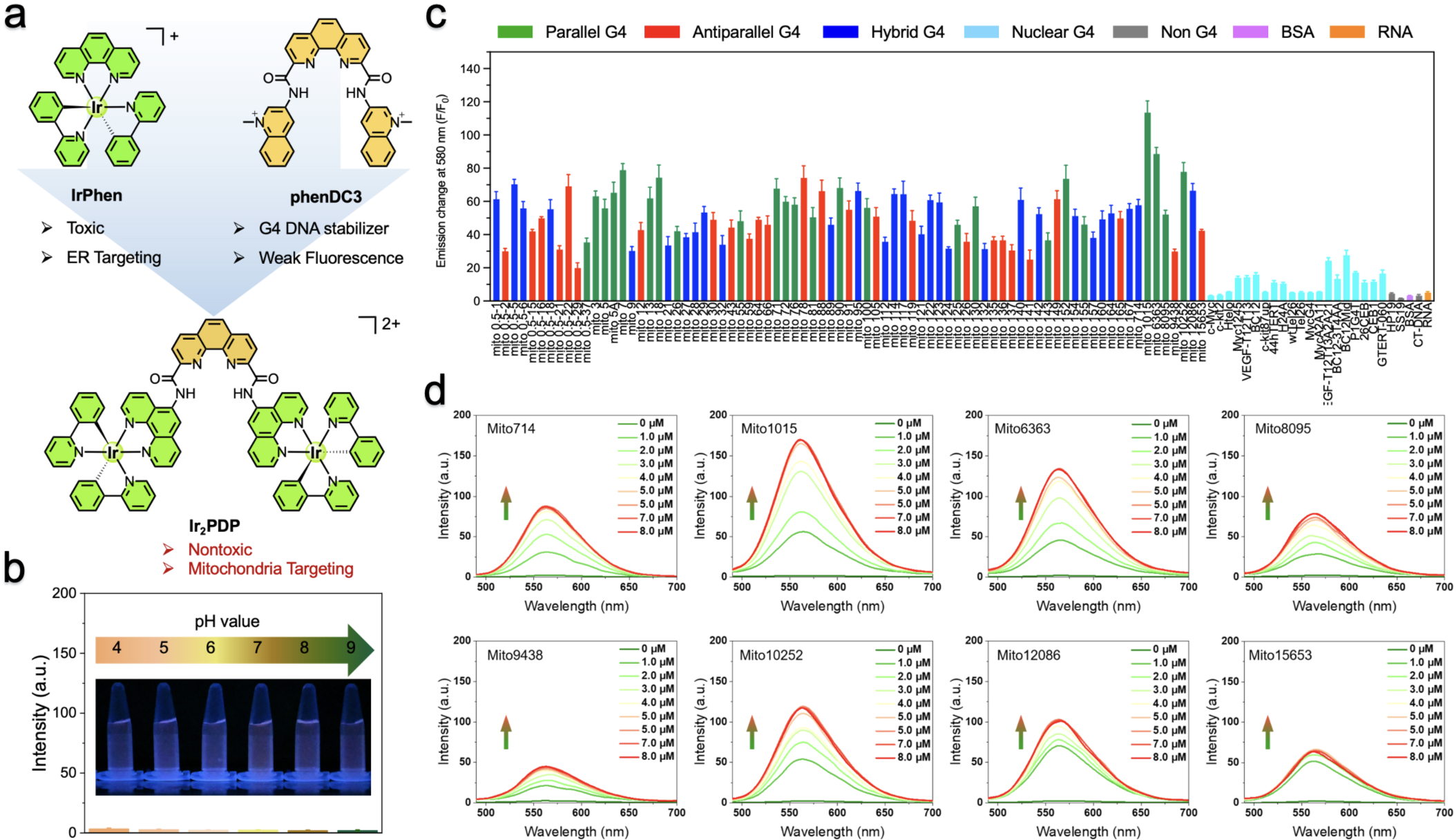 图2.(a) Ir2PDP、IrPhen和phenDC3结构图。(b)不同pH条件下Ir2PDP荧光图。(c) Ir2PDP对不同G4 DNA序列、非G4 DNA序列、双链DNA、RNA及蛋白质的磷光响应强度变化。(d)不同mitoG4 DNA序列滴定Ir2PDP的磷光强度变化图。