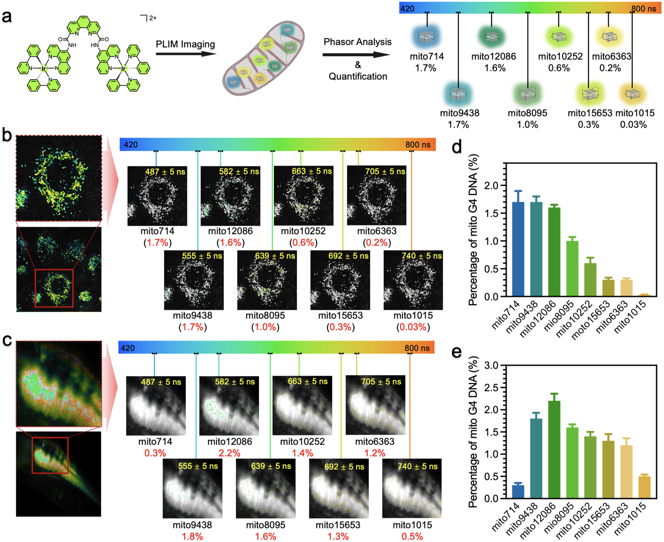 基于分子水平上Ir2PDP与不同序列mitoG4 DNA结合后呈现的显著磷光寿命差异,本研究以Ir2PDP为mitoG4 DNA靶向探针,建立了双光子磷光寿命检测技术与相量分析联用的检测体系。通过相量分析策略实现不同序列mitoG4 DNA特异性信号的精准剥离与积分,最终在 HeLa 细胞及斑马鱼模型中,成功完成了8种mitoG4 DNA结构的空间分布可视化检测与定量分析。