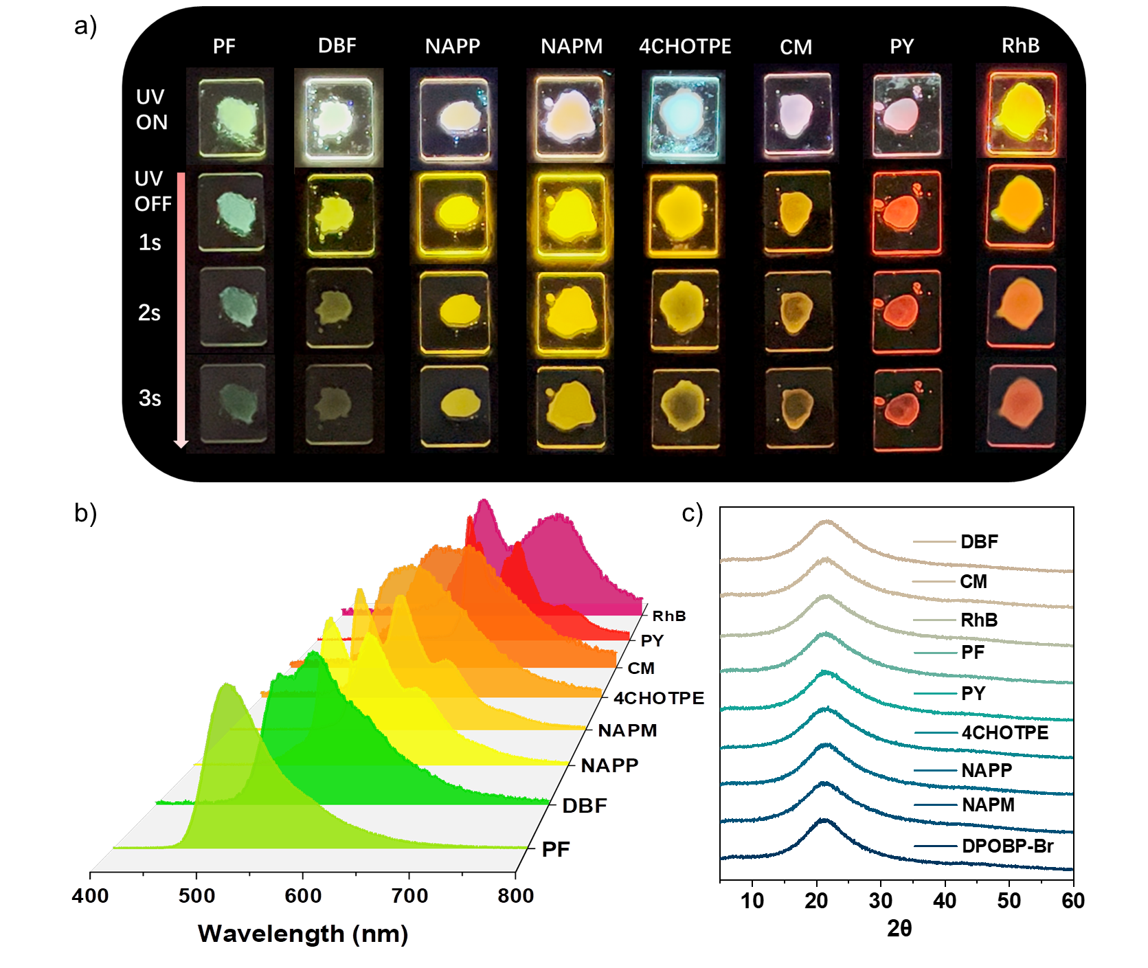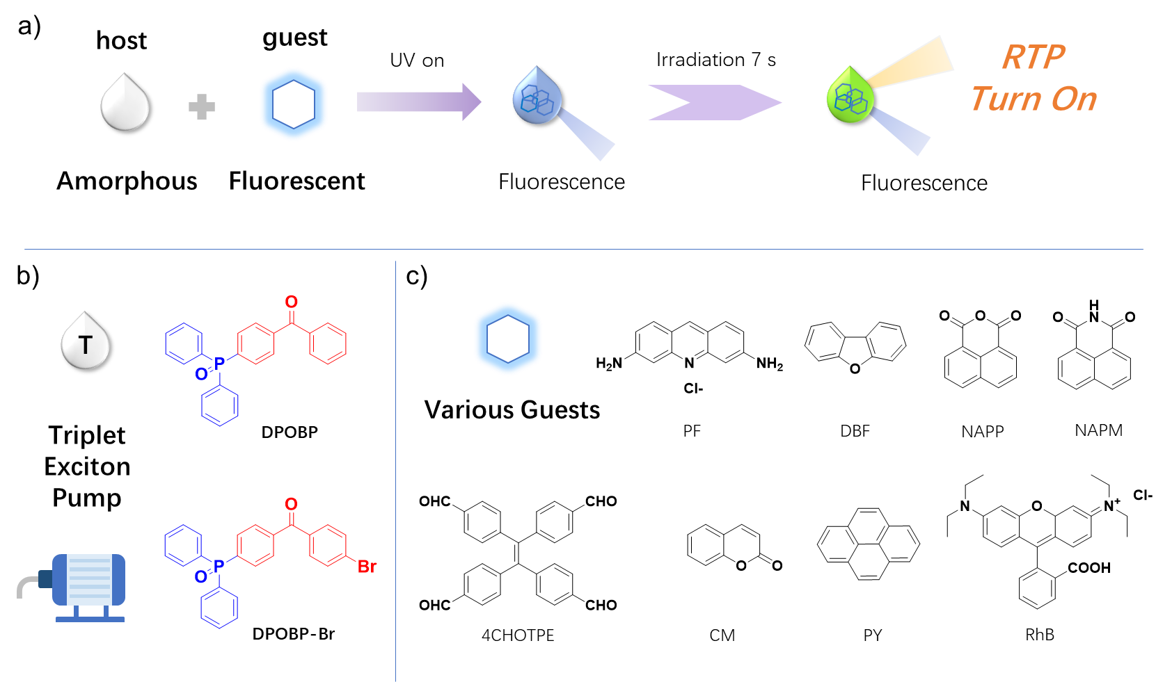 近日,化探花精选的池振国教授、杨志涌副教授研究团队通过将4-溴-二苯甲酮和二苯基氧膦结合,设计合成了一类新型无定形有机小分子主体DPOBP-Br。该主体不但可以形成连续的透明无定形薄膜,而且可以作为一台“三线态激子引擎”,激活掺杂在其中荧光客体的RTP。将各种类型的商用有机荧光分子(包括分子和离子,ACQ和AIE荧光材料,纯碳氢分子和含杂原子、杂环分子等)按1%的质量比掺杂到主体DPOBP-Br中,通过简单的加热冷却即可获得室温磷光性能各异的小分子无定形掺杂薄膜(图1)。