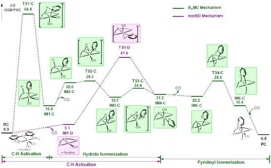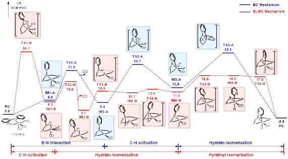 系统的反应机理路径势能面研究表明:该类LA-TM体系倾向于通过硼导向氧化加成(BD)机理或者碳负型硼金属协同(BCMC)进行吡啶C-H键活化,其决速步的活化自由能变分别为29.2 kcal/mol (TS3-A)和30.1 kcal/mol (TS1-B)。相反,氢负型硼金属协同(BHMC)机理和非导向氧化加成(nonBD)机理则需要克服较高的反应能垒,可能性较低。