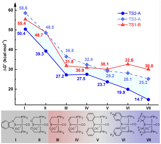 在上述机理认识的启发下,作者设计了一系列新型PBP-Ir配合物,探视Lewis酸配体要素的影响。研究发现引入给电子基团降低路易斯酸性,会大大降低PBP-Ir配合物对吡啶C-H键活化的活性。因此设计较强路易斯酸性配体有助于开发高效的LA-TM吡啶活化体系。BD机理与BCMC机理之间竞争也受到配体路易斯酸性的影响,随着配体路易斯酸性的增强,硼导向氧化加成(BD)机理的竞争会变得更有优势(VI和VII)。这些结果有助于深入了解路易斯酸性的硼基在吡啶选择性邻位C-H键活化的过程中的作用和角色,同时也对新型LA-TM体系的理性设计以实现在更温和条件下的杂环区域选择性C-H键活化具有启发性的意义。