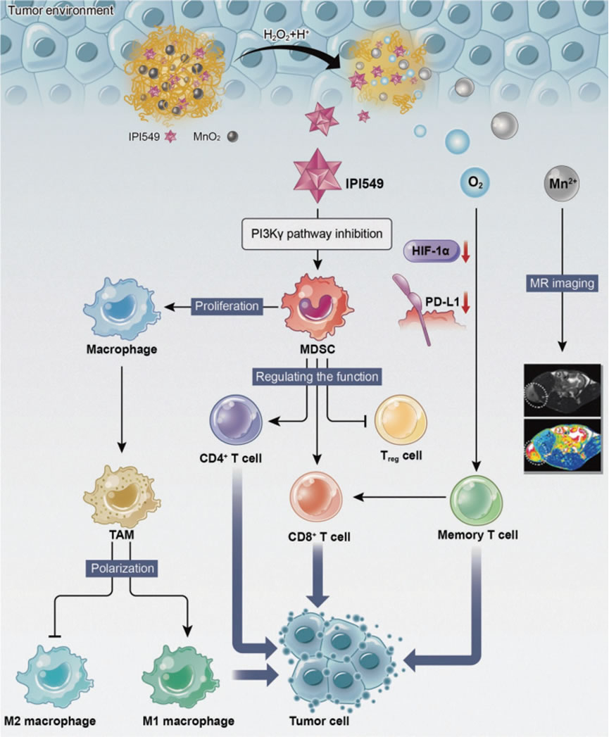 因此探花精选 材料科学与工程探花精选帅心涛教授课题组与探花精选 孙逸仙纪念医院沈君教授课题组,开发了一种包含MnO2颗粒和小分子IPI549的多功能纳米调节剂,它可以重塑肿瘤免疫微环境 (TIME) 以释放免疫系统。通过静脉给药的纳米调节剂能有效地积聚在肿瘤部位,通过氧化还原 MnO2 来缓解缺氧,并通过IPI549在肿瘤微环境 (TME)中的释放抑制MDSC上调的PI3Kγ,这使得在 PD-L1表达的同时下调肿瘤相关巨噬细胞针对促炎性M1 样表型的极化(TAMs)(肿瘤抑制),增强CD4+辅助T淋巴细胞(Th细胞)和细胞毒性 CD8+T淋巴细胞(Tc 细胞)的浸润,并抑制调节性T淋巴细胞(Treg 细胞)的浸润以有效肿瘤免疫治疗。此外,TME 中 Mn2+的局部生成可以使肿瘤部位产生特异性磁共振成像 (MRI)。此外,由于缺氧的缓解以及MDSC PI3Kγ 抑制的协同作用,纳米调节器重塑的TIME能被机体有效保留,在动物实验研究中在用药后能有效地抑制肿瘤再生长和转移。