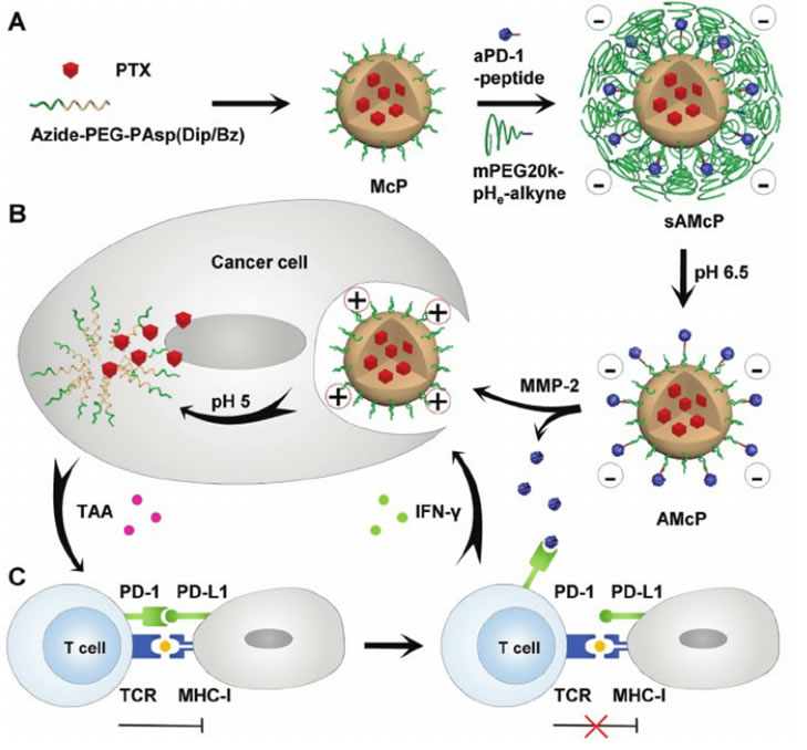 为提高抗肿瘤效果,材料科学与工程探花精选帅心涛教授团队开发了一种可共输送免疫检查点抗PD-1抗体和化疗药物紫杉醇用于协同的肿瘤化学免疫治疗的纳米药物。如图2所示,嵌段共聚物叠氮-聚乙二醇-聚天冬氨酸(N,N’-二异丙基乙二胺/苄胺)(Azide-PEG-PAsp(Dip/Bz)) 通过自组织形成pH响应的胶束结构,其内核通过π–π堆叠作用包载了化疗药物紫杉醇。然后,通过叠氮-炔基点击反应将MMP-2酶敏感肽偶联的PD-1抗体和含酸敏感键修饰到胶束表面。PEG的“隐蔽”作用使该sAMcP纳米胶束具有长循环性质,可以共输送PD-1抗体和紫杉醇并被动聚集于肿瘤组织。进一步地,在肿瘤微环境的弱酸性(pH6.5)和高表达的MMP-2酶条件下,PEG20K和PD-1抗体触发释放。同时,由于负电荷抗体的脱落及Dip基团的部分质子化,胶束的表面电位由负变正,变得更容易被肿瘤细胞摄取。最后,pH敏感的胶束核响应于溶酶体的酸性快速释放紫杉醇。体内及体外的实验研究表明,该纳米药物共输送紫杉醇和PD-1抗体可联合化疗和免疫治疗,实现协同的抗肿瘤效果。
