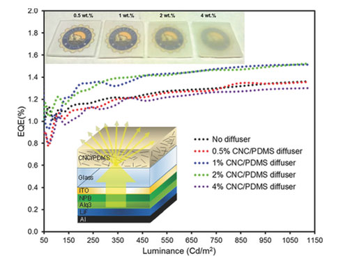Abstract: A novel optical diffuser based on cellulose nanocrystals (CNCs) embedded in polydimethylsiloxane (PDMS) matrix, or cellulose nanocrystal:polymer (CNP) is reported. By offering simple low-cost fabrication process as well as compatibility with large-scale production, the proposed...Read More