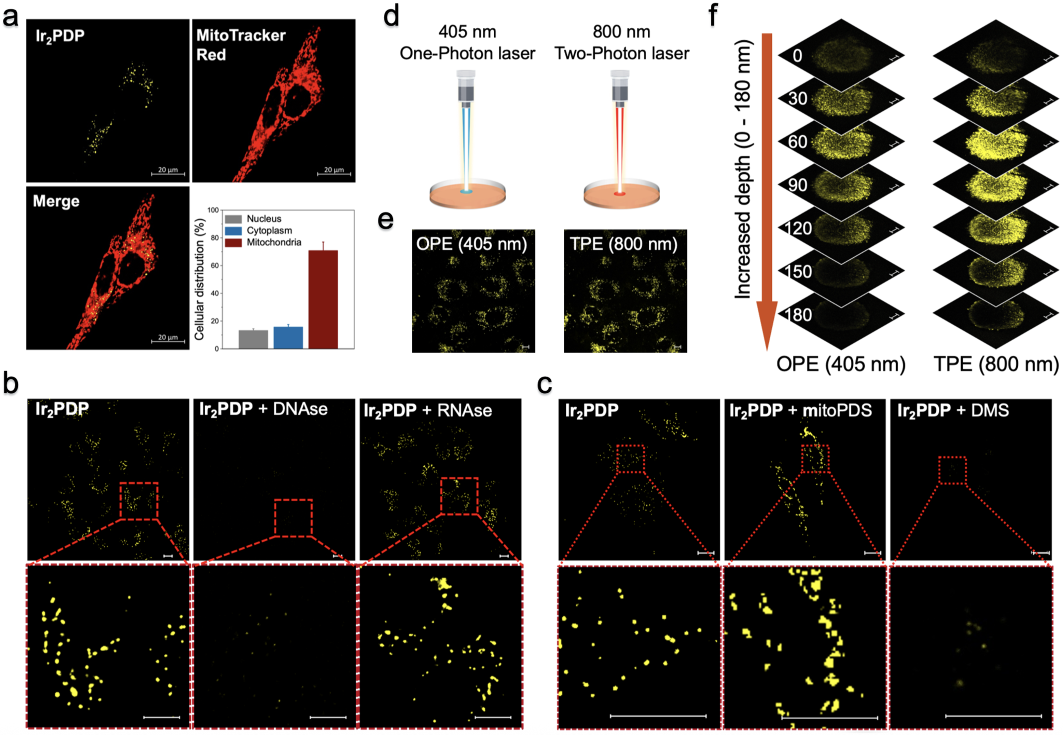 图4. (a) Ir2PDP线粒体靶向检测结果。(2)DNA酶和RNA酶消化细胞后,Ir2PDP共聚焦成像检测结果。(c) mitoPDS和DMS预孵育细胞后,Ir2PDP共聚焦成像检测结果。(d)单双光子成像示意图。(e)单光子(405 nm)和双光子(800 nm)激光共聚焦成像结果。(f)单光子(405 nm)和双光子(800 nm)激发下,Ir2PDP组织3D细胞球穿透深度模拟检测。