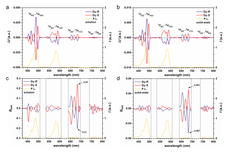 图 3. Dy-S/R室温下的圆偏振发光(CPL)性能,包括溶液态(CH2Cl2,a、b)和固态(c、d)下的 ΔI(a、c)与 glum值(b、d)。