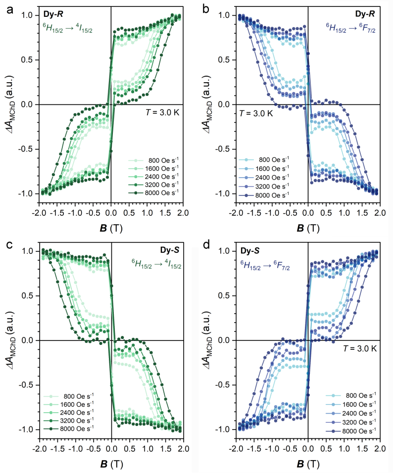 变温、变磁场的磁-手性二色性光谱(MChD)表明,Dy-S/R配合物存在天然光学活性与磁性的协同作用,其中,具有NCD 活性的 4I15/2← 6H15/2跃迁在 3.0 K 下呈现出 gMChD = 0.18(1) T⁻¹的信号,这是目前已报道的 Dy3+手性配合物中最强的磁-手性光学响应之一。与此同时,该配合物在低温下显示出显著的 SMM 行为,包括零场下超过 800 K 的有效能垒和8 K下的磁滞效应。利用天然光学活性、磁光学活性和 SMM 行为之间的协同作用,低温动态 MChD 测量能够高分辨地光学追踪两种对映体及不同电子跃迁对应的磁滞回线,从而实现对SMM行为的光学读取(图4),这一结果可望为光子学与磁数据读取开辟了新方向。