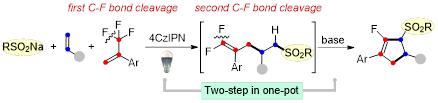 Photocatalytic Defluorinative Three-Component Reaction of α-Trifluoromethyl Alkenes, Alkenes, and Sodium Sulfinates: Synthesis of Monofluorocyclopentenes.