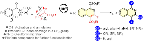 Rh(III)-Catalyzed Defluorinative [4 + 2] Annulation of N‑Sulfonylarylamides with Ethyl 2-Diazo-3,3,3-trifluoropropanoate: Synthesis of 1,3,4-Functionalized Isoquinolines.